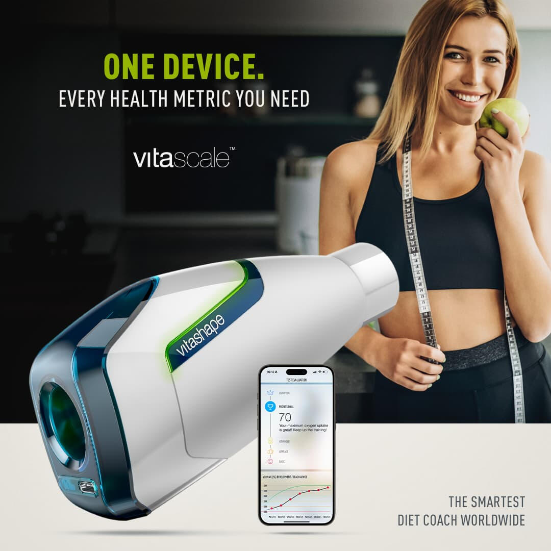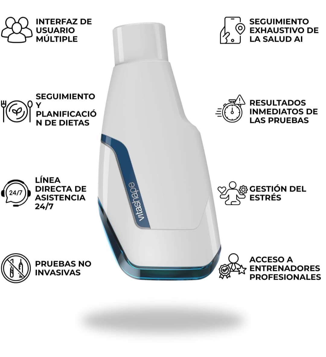 --> vitashape es un avanzado dispositivo de análisis del aliento que detecta biomarcadores clave en tu aliento para proporcionar información en tiempo real sobre las funciones vitales de tu cuerpo, como el metabolismo en reposo, la tasa de quema de grasa y los niveles de estrés. Basándose en estos datos, vitashape también recomienda un plan de dieta personalizado adaptado a su perfil metabólico único.